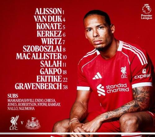 利物浦首发:1-阿利松、6-凯尔凯兹、4-范戴克、5-科纳特、8-索博斯洛伊、38-赫拉芬贝赫、10-麦卡利斯特、11-萨拉赫、7-维尔茨、18-加克波、22-埃基蒂克