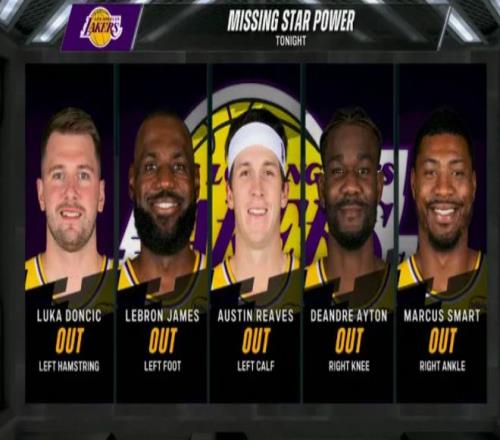 北京时间2月11日,NBA2025-26赛季常规赛迎来西部焦点之战,洛杉矶湖人队坐镇主场,继续迎战圣安东尼奥马刺队。让人担心的是,背靠背的湖人队迎来严重的伤病潮,球队官方确认,五大核心詹姆斯、东契奇、里夫斯等人全部缺席,昨天主场败给联盟第一的雷霆后,还面临背靠背作战的严峻体能考验,缺兵少将加上体能劣势,让湖人的处境雪上加霜。