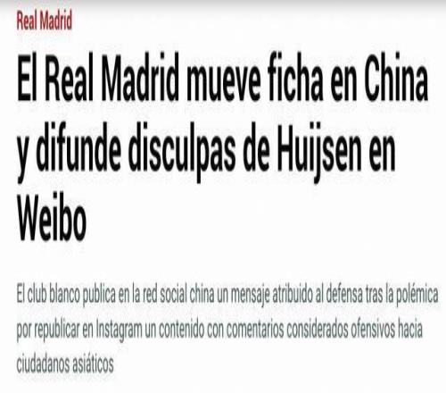 马卡与世体报道了赫伊森转发辱华内容的事件,并写道:“皇家马德里俱乐部在其官方微博账号上发表了声明,该账号主要面向中国用户,这条微博引发了中国球迷的强烈批评,他们质疑道歉的诚意,并要求俱乐部在国际平台上发表公开声明或发布视频,而不仅仅是一份书面声明。”同时,两家媒体也介绍,皇马在2024年也曾卷入此类事件。