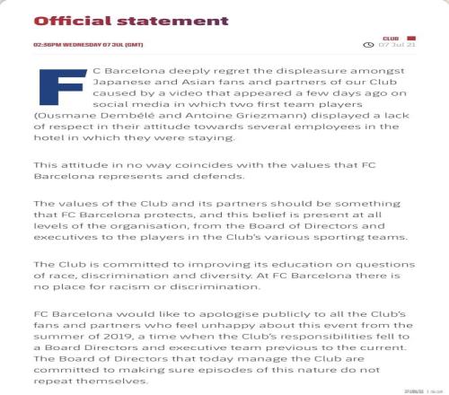 2019年巴萨亚洲行期间,格列兹曼和登贝莱有种族歧视行为,巴萨在官网发布道歉声明:“一段我俱乐部两名球员用轻佻和缺乏尊重的语言称呼他们所住的酒店员工的视频流传出来,引起了日本球迷、亚洲球迷以及我们的合作伙伴的不满。巴塞罗那俱乐部对此不满表示理解并深表遗憾,向每一个因为2019年亚洲行感到不快的球迷和成员们道歉。”格列兹曼和登贝莱本人也在外国社媒上公开道歉。