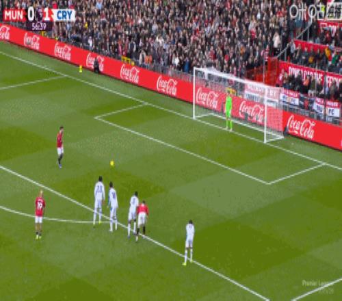 比赛第56分钟,拉克鲁瓦拉拽库尼亚送红点,B费点射命中,曼联1-1扳平水晶宫。