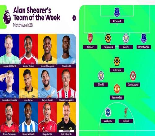 英超联赛官方公布了阿兰-希勒评选的第28轮最佳阵容,埃基蒂克、布鲁诺-费尔南德斯、谢尔基、廷贝尔等人在列。