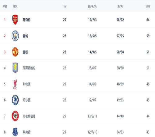 在积分榜上,阿森纳依然占据榜首位置。阿森纳战绩是19胜7平3负,拿到64分。而曼城紧随其后,拿到59分,比阿森纳少踢1场。曼联已经来到了第3的位置,拿到51分。阿斯顿维拉也是51分,排名第4。输球的利物浦依然是48分,排名第5。至于切尔西,只拿到45分,排名第6。不过,切尔西比利物浦少踢1场。热刺的战绩极差,只拿到29分,排名第16,与降级区只有4分的差距。