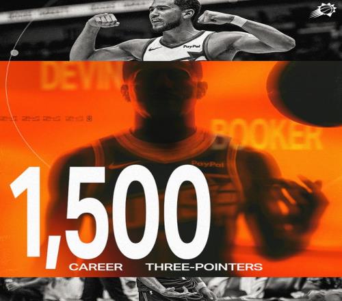 此役布克完成常规赛1500三分大关,他在720场或更少的比赛中拿到17000分+1500三分历史第三,比肩库里、利拉德。布克全场比赛19中6,三分9中4仅拿到17分6助攻4篮板3失误。