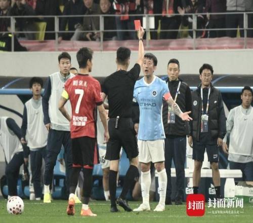 上半场比赛,深圳新鹏城先发制人,开场第5分钟,阿代米接到夏合扎提传球晃过两名蓉城后卫后推射破网,客场作战的新鹏城1-0领先。落后的成都蓉城并不慌乱,依然按照自己节奏稳扎稳打。比赛在第18分钟出现戏剧性转折,姜至鹏在抢球时肘击席尔瓦,席尔瓦被打得满嘴是血。裁判先是判罚了黄牌,观看VAR后改判红牌将姜至鹏罚下。