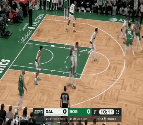 塔图姆尺寸视野出球协防,杰伦力量强攻中投领防。历来是塔图姆策动,杰伦攻坚。