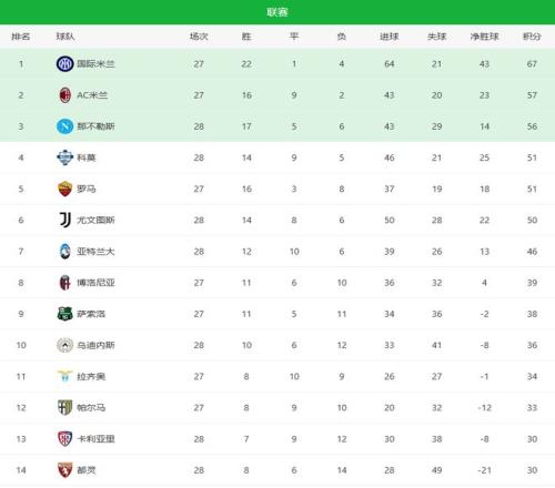 目前,国际米兰依旧牢牢占据榜首位置,以67分遥遥领先。排名第二的是AC米兰,他们目前拿到57分,落后国米10分。卫冕冠军那不勒斯则以56分排在第三。