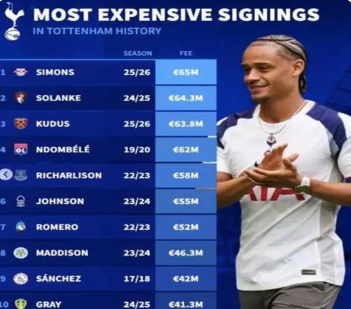 6500万欧元,34场2球5助,身穿孙兴慜留下的7号球衣。这三个数字放在一起,就是对西蒙斯本赛季最残酷的总结。