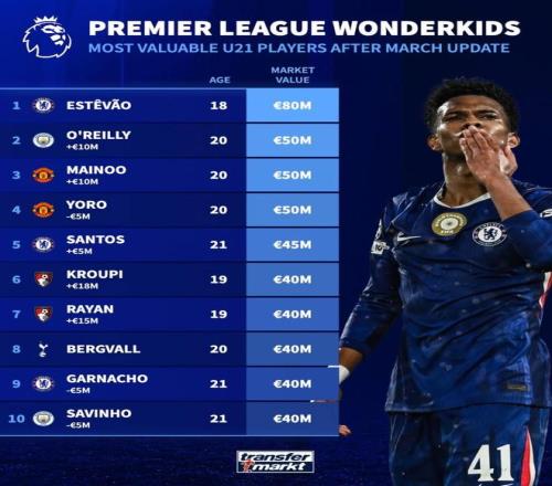 北京时间3月10日,在更新了英超球员的身价之后,德转还列出了此次更新后英超身价最高的10名U21球员,埃斯特旺以8000万欧元高居第一,尼科-奥赖利、梅努、约罗5000万欧元并列第二。