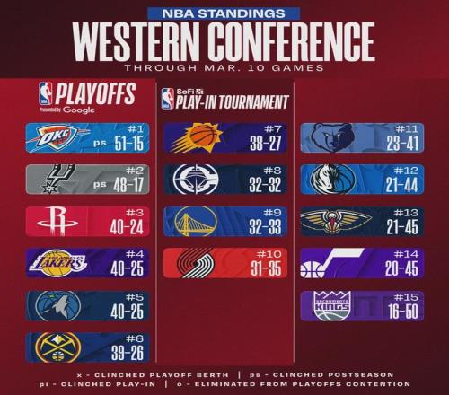 北京时间3月11日,NBA常规赛,湖人120-106击败森林狼。詹姆斯因伤继续休战,东契奇和里夫斯合砍62分。此役过后,西部排名发生不小的变化:森林狼40胜25负,从西部第3跌至第5;湖人同样40胜25负,从西部第5升至第4。