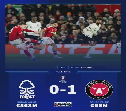 德国转会市场的数据冰冷而残酷:诺丁汉森林全队身价5.68亿欧元,队内拥有多名前英超豪门球星;而他们的对手中日德兰,全队身价仅9900万欧元,甚至不到森林的一个零头。