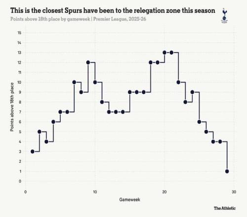 变化不小,但最引人注目的事件是,几周来一直在降级区边缘徘徊的热刺,如今已正式加入了保级派对。他们是英超中唯一一支在2026年至今仍未尝胜绩的球队。下图清晰地展示了这一糟糕状态如何让他们深陷降级区泥潭。上周四1-3负于来访的水晶宫意味着他们现在仅比排名第18位的西汉姆联高出一分。
