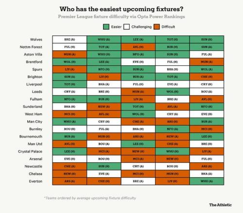 就森林而言,根据Opta实力排名,他们接下来五个对手的赛程最为轻松,首先是周日主场迎战富勒姆。这家西伦敦俱乐部排名第十,似乎正朝着又一个中游赛季平淡地迈进。佩雷拉的球队应该具备战意优势,即便富勒姆仍抱有微弱的欧战资格希望。