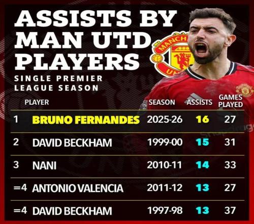 更值得一提的是,凭借助攻梅开二度,他也超越了曼联队内由小贝保持长达26年的英超15次助攻纪录。在1999/2000赛季中,小贝贡献了15次英超助攻,而现在B费的助攻次数达到16次。