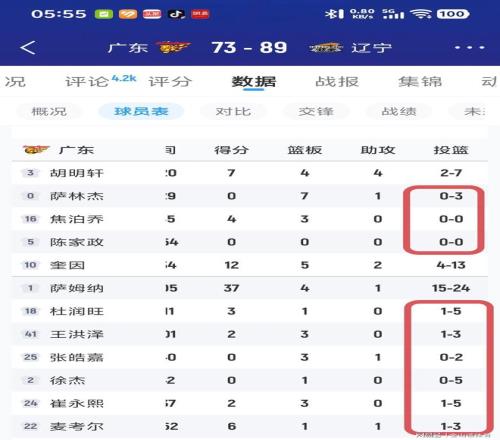 此役,广东队3个首发球员,萨林杰、焦泊乔和陈家政,3人合起来得4分,运动战是1分没得。而几名主要替补球员,徐杰、杜润旺、王洪泽、张皓嘉、崔永熙和麦考尔,6人合计23投4中。上述9名球员,加在一块共得了17分,广东队这球,输的一点都不冤。