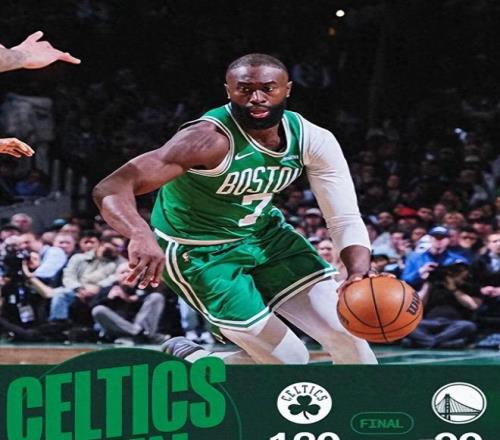 波士顿北岸花园球馆,杰伦·布朗用32分6篮板5助攻的表现带领凯尔特人大胜勇士,生涯总得分超越戴夫·考恩斯,跻身绿军队史前十。