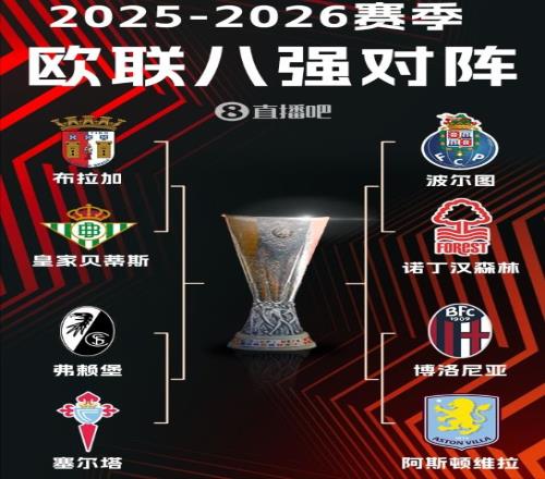 就此,八强对阵分别是布拉加对贝蒂斯、弗莱堡对塞尔塔、波尔图对诺丁汉森林、博洛尼亚对阿斯顿维拉。欧联杯的1/4决赛第一回合将在4月8日、10日开打,之后次回合会在16日、17日开打。