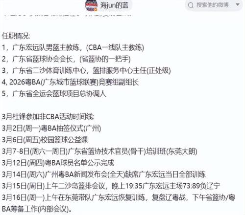 媒体人“海jun的蓝”看热闹不嫌事大,赛后也发布长文晒出了杜锋近日的行程安排,这波操作,更加让广东球迷破大防。