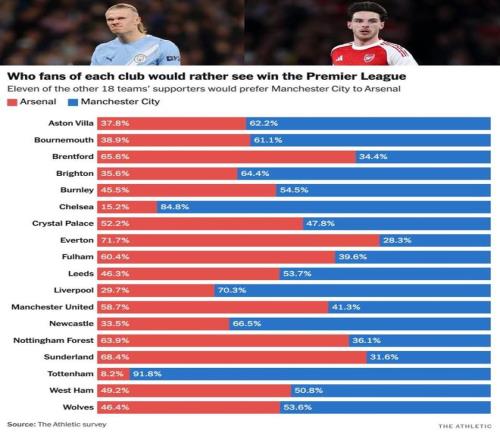 The Athletic对英超18支球队的球迷发起调查:你支持谁赢得英超冠军?阿森纳还是曼城?最终,11家球迷更支持曼城,7家球迷更支持阿森纳。