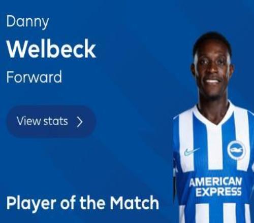 英超第31轮,布莱顿主场2-1击败利物浦,此役上演梅开二度的布莱顿前锋维尔贝克当选全场最佳球员。