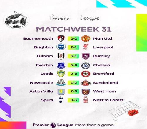 北京时间3月23日晚,本轮英超除曼城对阵水晶宫延期外,其他9场比赛全部结束。由于本周阿森纳在联赛杯决赛对阵曼城,双方本轮联赛改期进行(阿森纳比赛提前至2月19日,曼城比赛则推迟,具体时间待定)。在提前进行的那场对决之中,狼队爆冷2比2逼平领头羊阿森纳,如今枪手多赛一场情况下仍领先曼城9分;本周开打的8场英超31轮比赛中,曼联2比2被伯恩茅斯逼平仍位列第三;而阿斯顿维拉2比0轻取保级球队西汉姆联,离曼联仅剩1分;利物浦则是1比2负于布莱顿继续位居第五,切尔西0比3惨败埃弗顿,红蓝两军双双折戟。