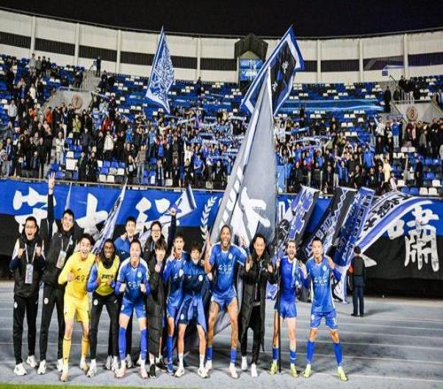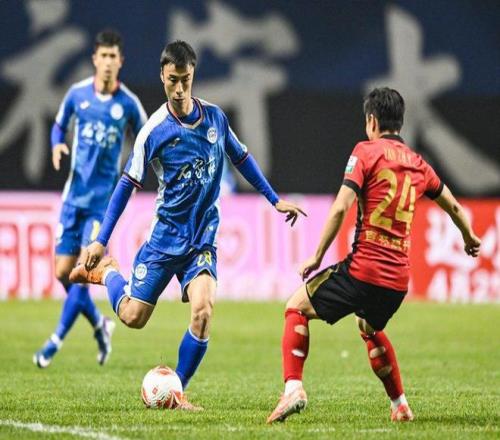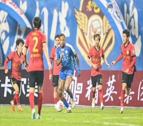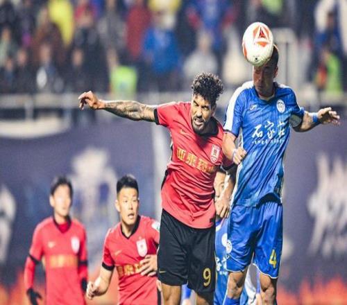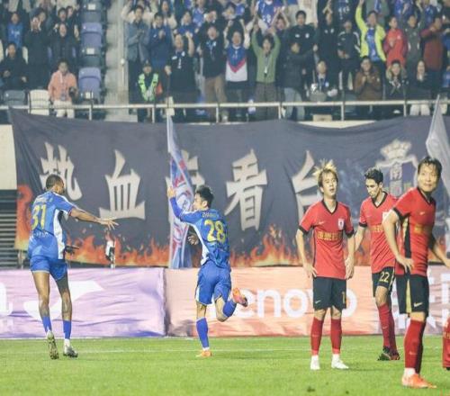 3月21日,石家庄功夫28号张煜东(左二)庆祝进球。