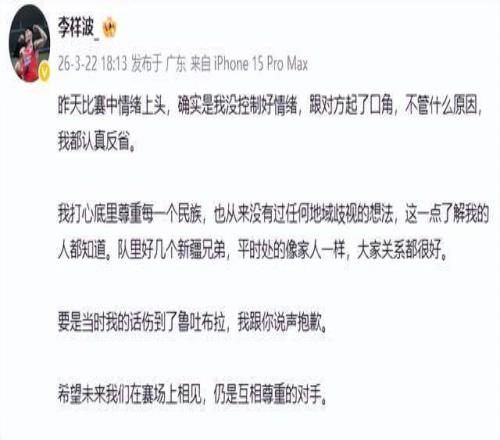 事件发酵后,李祥波于22日通过社交媒体发布致歉声明:“我打心底尊重每一个民族,从未有过任何地域歧视的想法。若我的言语伤害了鲁吐布拉,我向你真诚道歉。”其措辞诚恳,明确将事件归因于“情绪上头”,并主动承担沟通责任,展现出球员应有的担当。