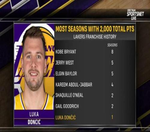 赛后根据统计,东契奇也就此成为了湖人队史第7位单赛季总得分达到或超过2000分的球员。