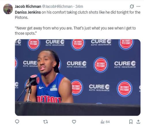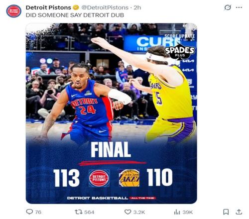 北京时间3月24日,活塞113-110击败湖人拿到4连胜。这场比赛活塞一度领先湖人16分之多,可在下半场被湖人疯狂追分,末节湖人一度反超但进入决胜时刻詹金斯这位24岁的后卫统治了比赛,决胜25秒里他一人拿到6分帮助活塞涉险过关。