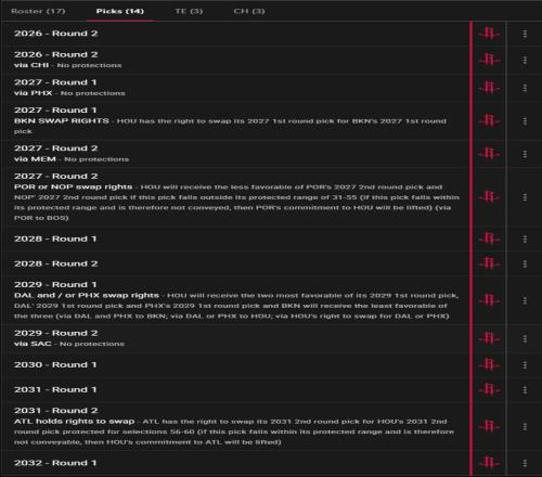 为何火箭队说他们有可以满足雄鹿的筹码呢?除了有像申京、伊森这样的出色年轻资产、杜兰特这样还在联盟顶级水准的球星外,火箭队未来6年里还有6个首轮签7个次轮签1个首轮互换权,雄鹿作为重建的球队他们最需要的就是选秀权资产。