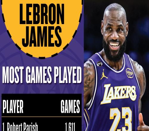 3月20日,湖人客场对决热火,詹姆斯背靠背出战,詹姆斯的出场数正式来到1611场,追平罗伯特·帕里什,并列NBA历史出场...