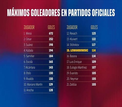 在与马略卡的西甲第23轮比赛中打入一球后,莱万巴萨生涯已打入114球,据巴萨官方统计,莱万升至队史射手榜第15位...