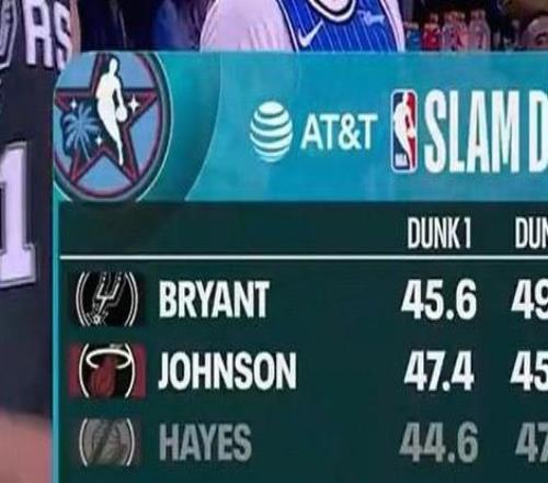 扣篮大赛首轮,卡特布莱恩特得到45.6分