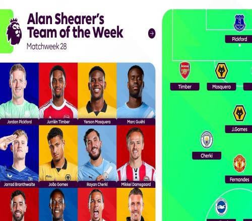 体育播报3月2日宣 阿兰·希勒选出英超第28轮最佳阵容,B费、埃基蒂克、格伊、谢尔基和廷伯入选。门将:皮克福德...